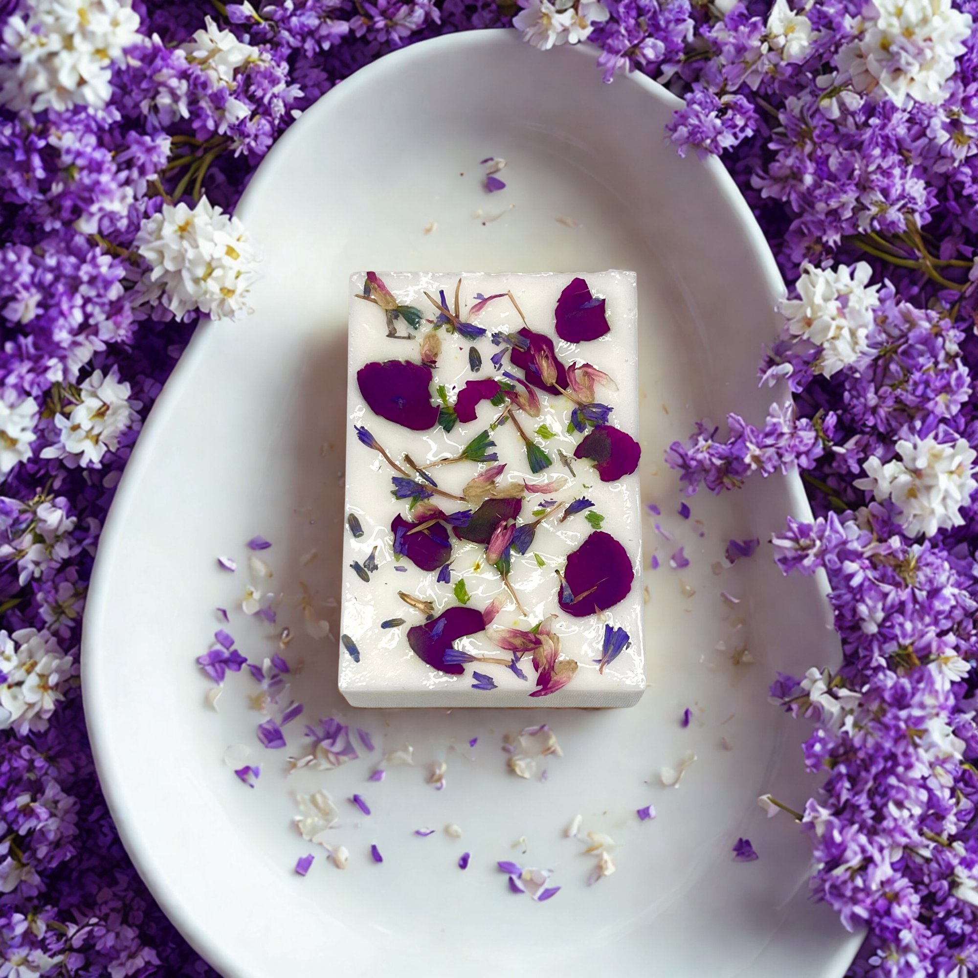 Ingredients: Saponified Olive, Palm, Coconut & Safflower Oil in a Castile Base, with Pure Essential Oils & Dried Flowers
